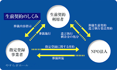 NPOとは「特定非営利活動法人」のことで、法律に基づき内閣府長官より認証を受けた法人で毎年の事業、 決算報告は役所を通じて一般に情報公開されます。その法人が「NPO」です。その役割は、あくまでも第三者として「生前契約者」と「生前契約を施行する登録業者」にたいして指導・管理を行い、契約者(消費者)を保護するものです。